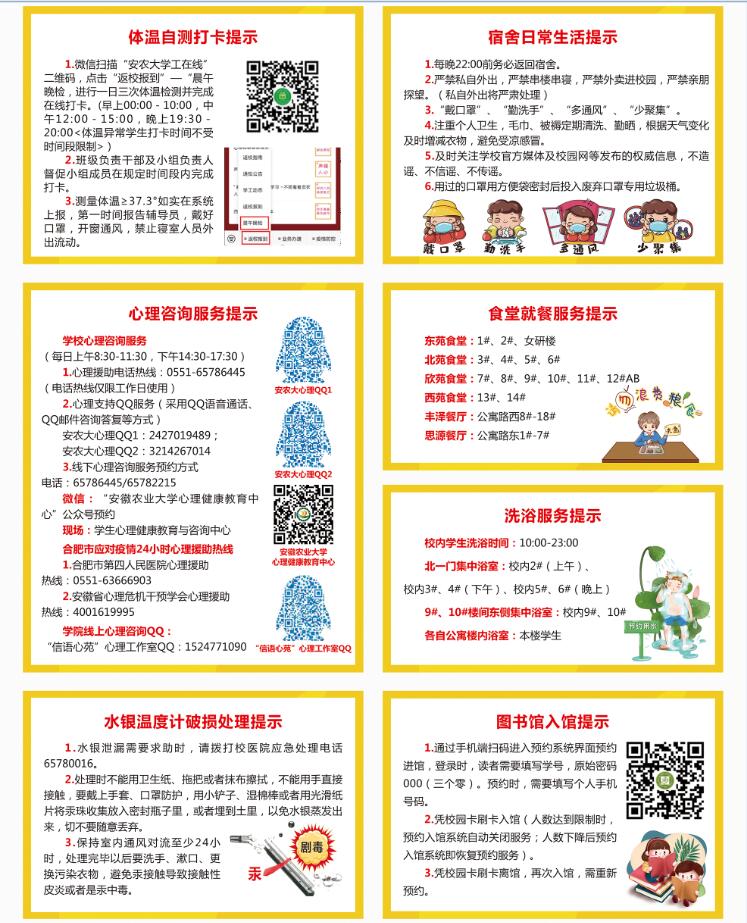 为切实做好返校后学生教育工作,通过组织学生以宿舍、班级、实验团队为单位,认真学习相关管理规定,严格执行“日报告、零报告”制度,落实日常防护措施,压实工作职责;依托学院微信、易班等平台陆续推出30余期战“疫”、抗“疫”、防“疫”类推文、短视频,制作200余张《信息与计算机学院疫情防控期间在校学生日常生活温馨提示》宣传单页、海报,做好疫情的及时公布和科普宣传工作,帮助学生提高防范意识,引导学生做好自我防控。