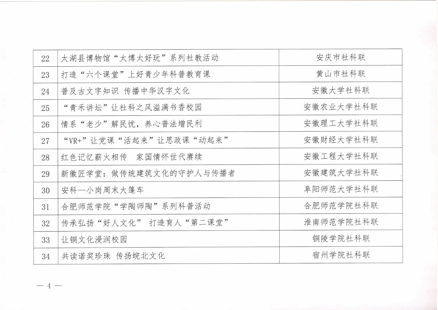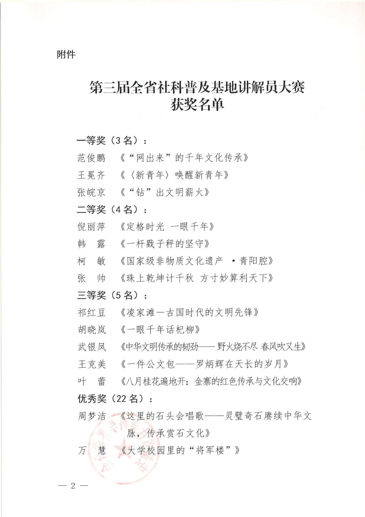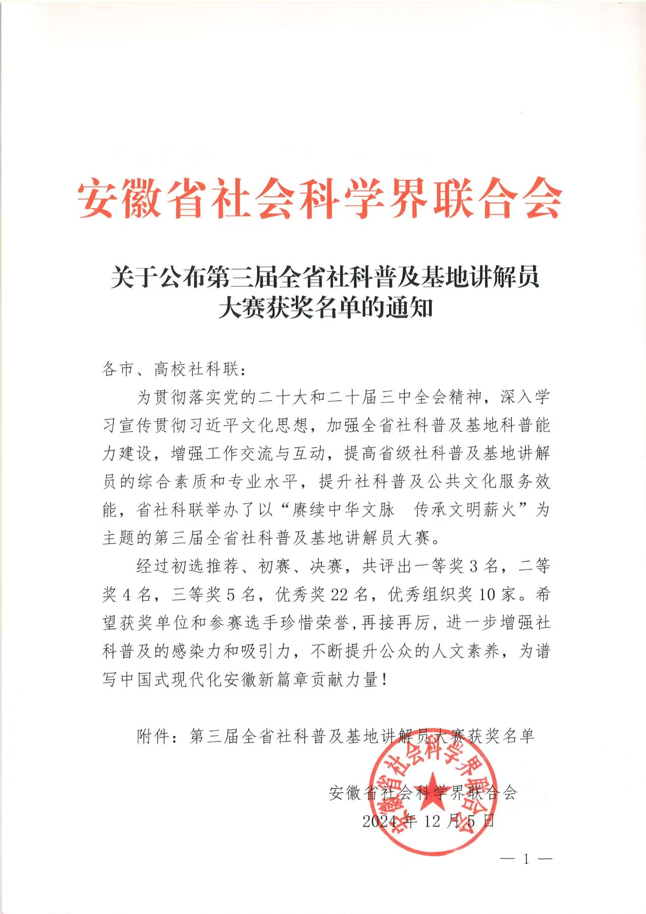 本网讯 近日,安徽省社会科学界联合会发布《关于公布安徽省社会科学普及优秀典型案例的通知》和《关于公布第三届全省社科普及基地讲解员大赛获奖名单的通知》,我馆朱建军老师报送的案例《青禾讲坛——让社科之风溢满书香校园》进入优秀典型案例公布名单;由朱建军老师策划、万慧老师讲解的《大学校园里的“将军楼”》获第三届社科普及基地讲解员大赛优秀奖。