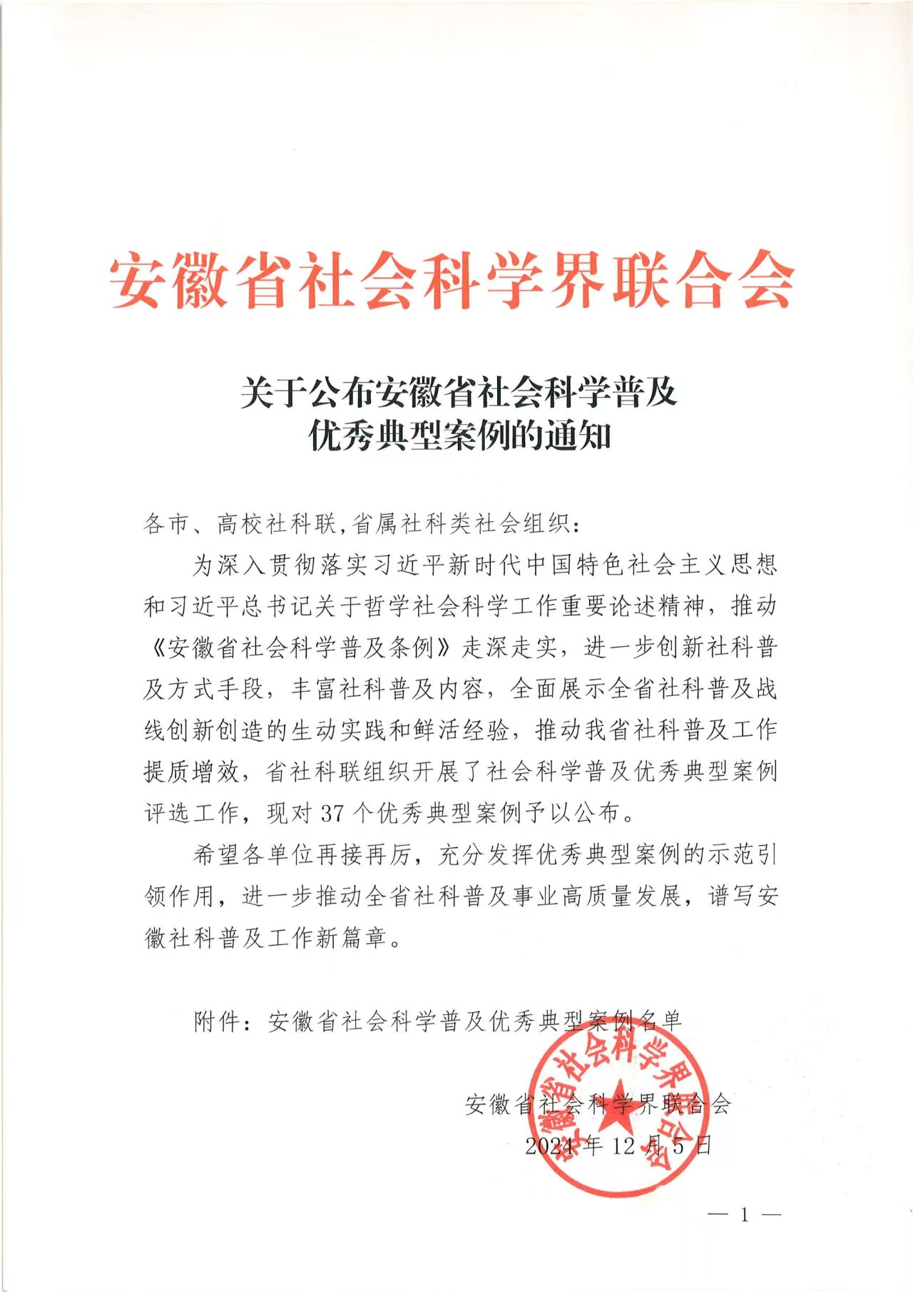 本次获奖,是自今年1月我馆获批安徽省社会科学普及基地以来获得的重要成果,是对我馆社科普及工作的肯定和认可。图书馆将以此为契机,充分发挥好优秀典型案例的示范引领作用,常态化、高质量推进社科普及工作开展。(文/朱建军 编辑/吴兰婷 预审/刘社文 审核/郑雪林)