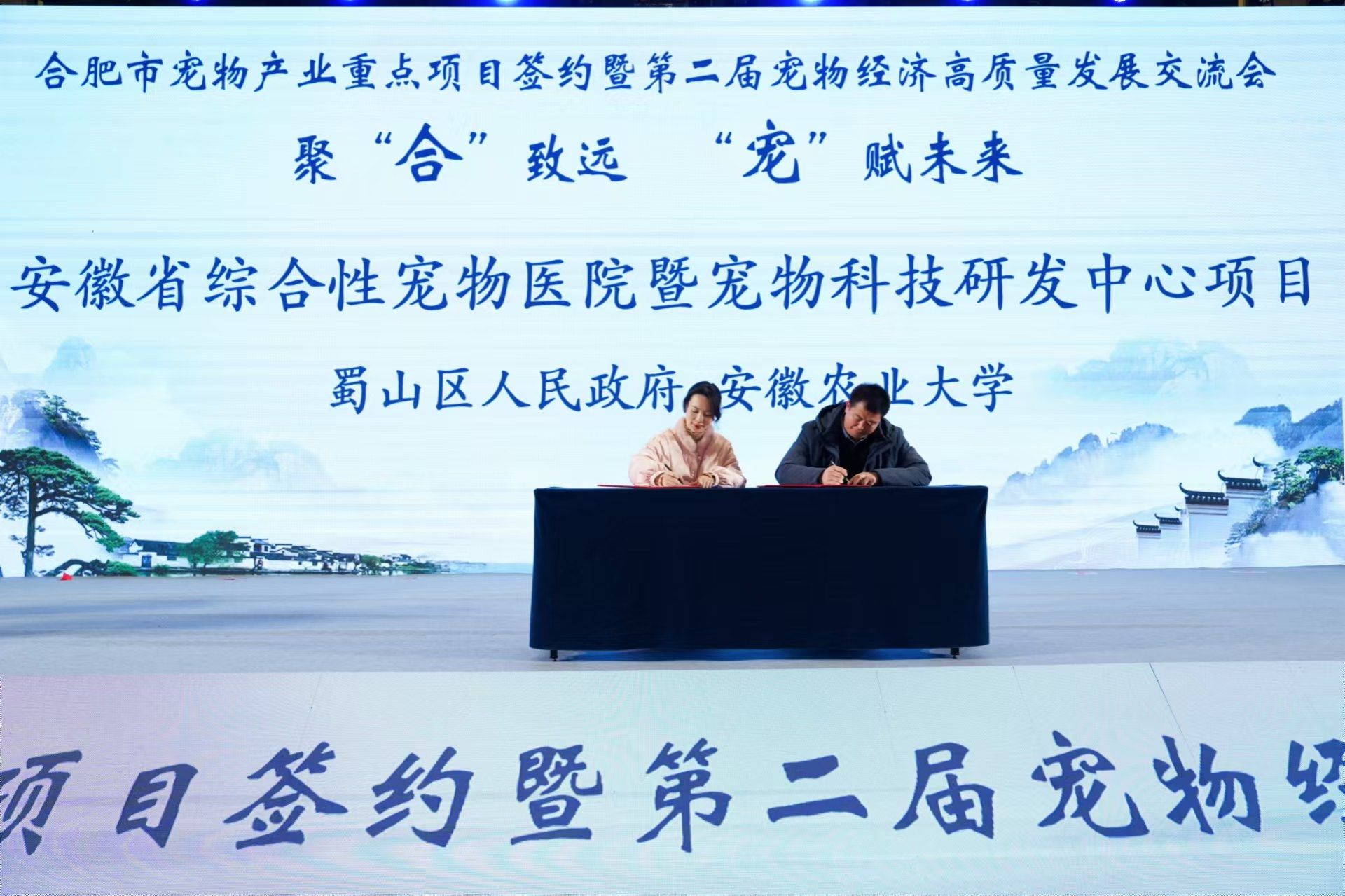 签约仪式上,王希春代表学校教学动物医学院与蜀山区签署安徽省综合性宠物医院暨宠物科技研发中心项目,推动建设区域高端宠物医疗中心、宠物培训中心、宠物综合服务中心,努力构建“一核、三中心、多组团、多业并举”产业布局。(图文/汪前 编辑/杜亚娜 预审/吴永红 审核/郑雪林)