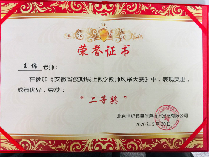 本网讯 经管学院青年教师王锦博士深入贯彻学校和教务处相关文件精神,落实学院相关要求,积极开展线上教学,在超星公司举办的安徽省疫情线上教学教师风采大赛中表现优异,荣获二等奖。
