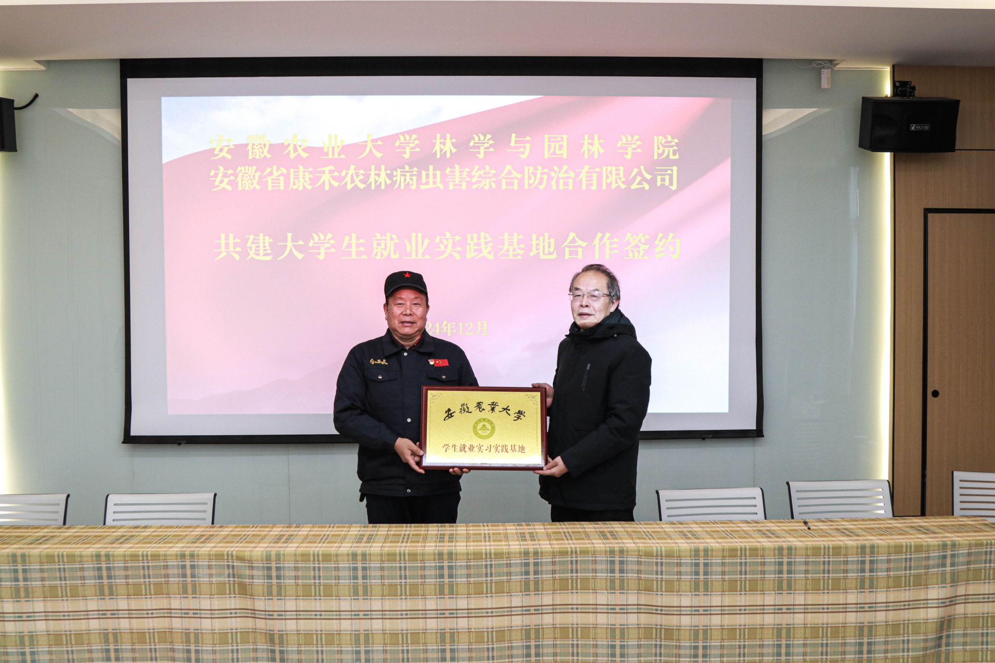 本网讯 12月13日,林学与园林学院与安徽省康禾农林病虫害综合防治有限公司进一步深化交流合作,并建立就业实训基地。学院党委书记江正君、林学系系主任唐雪海、安徽省康禾农林病虫害综合防治有限公司董事长黄国治及相关部门负责人出席就业实训基地签约仪式。