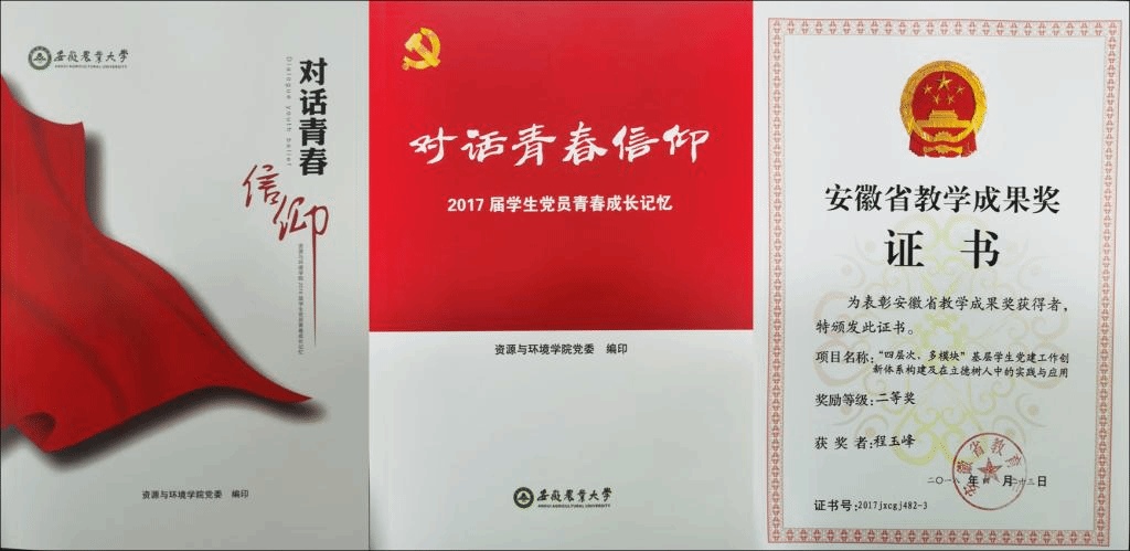 2017年,以支部工作为基础凝练的《“四层次、多模块”基层学生党建创新工作体系在立德树人中的应用与实践》获安徽省教学成果二等奖。2015年、2017年,学生党建工作体系和模式两次应邀在全国农林院校资源环境类学院党建与学生工作研讨会上作经验交流。学院先后迎接全省高校组织部长会议、山东农大、福建农林、安庆师大等30余次来院调研学生党建工作。