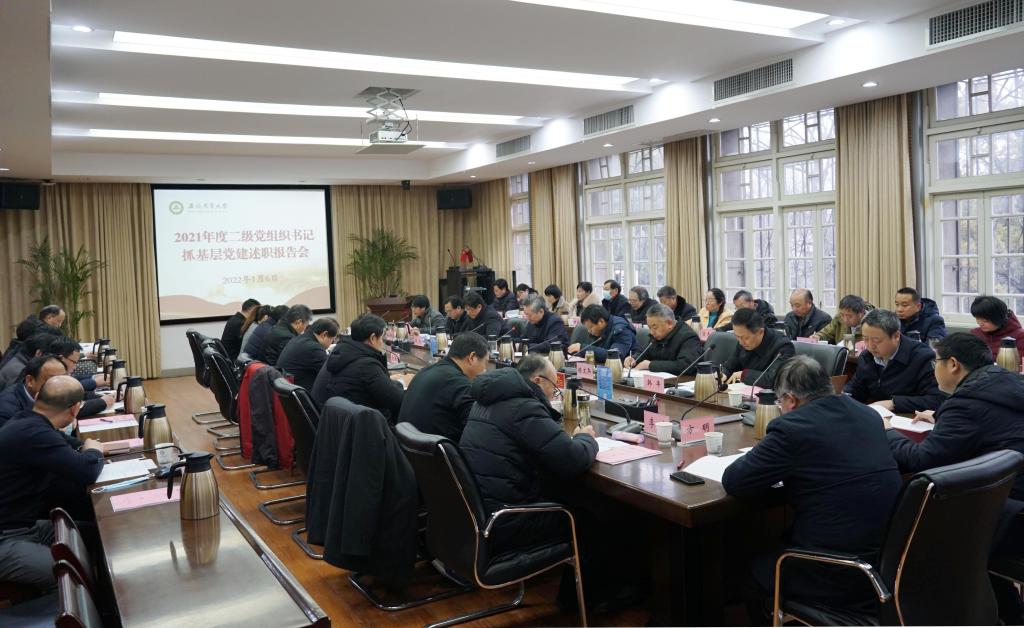 本网讯 1月6日上午,校党委书记江春在第三会议室主持召开2021年度二级党组织书记抓党的建设述职评议考核会暨党建工作领导小组会议。校领导裴树东、韩军、陈文兵、操海群出席会议。校党委委员、校党建工作领导小组成员、各二级党组织书记、学院院长,部分“两代表一委员”参加会议。