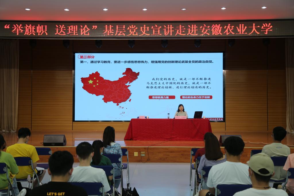 本网讯6月15日,全省“举旗帜•送理论”基层党史专题宣讲报告会在我校大学生活动中心举行。安徽建筑大学公共管理学院党委副书记马晓艳作《学百年党史 做新时代青年》的宣讲报告,校团委负责同志主持会议,各学院团委负责老师、校青马班学员和团员代表现场聆听宣讲。