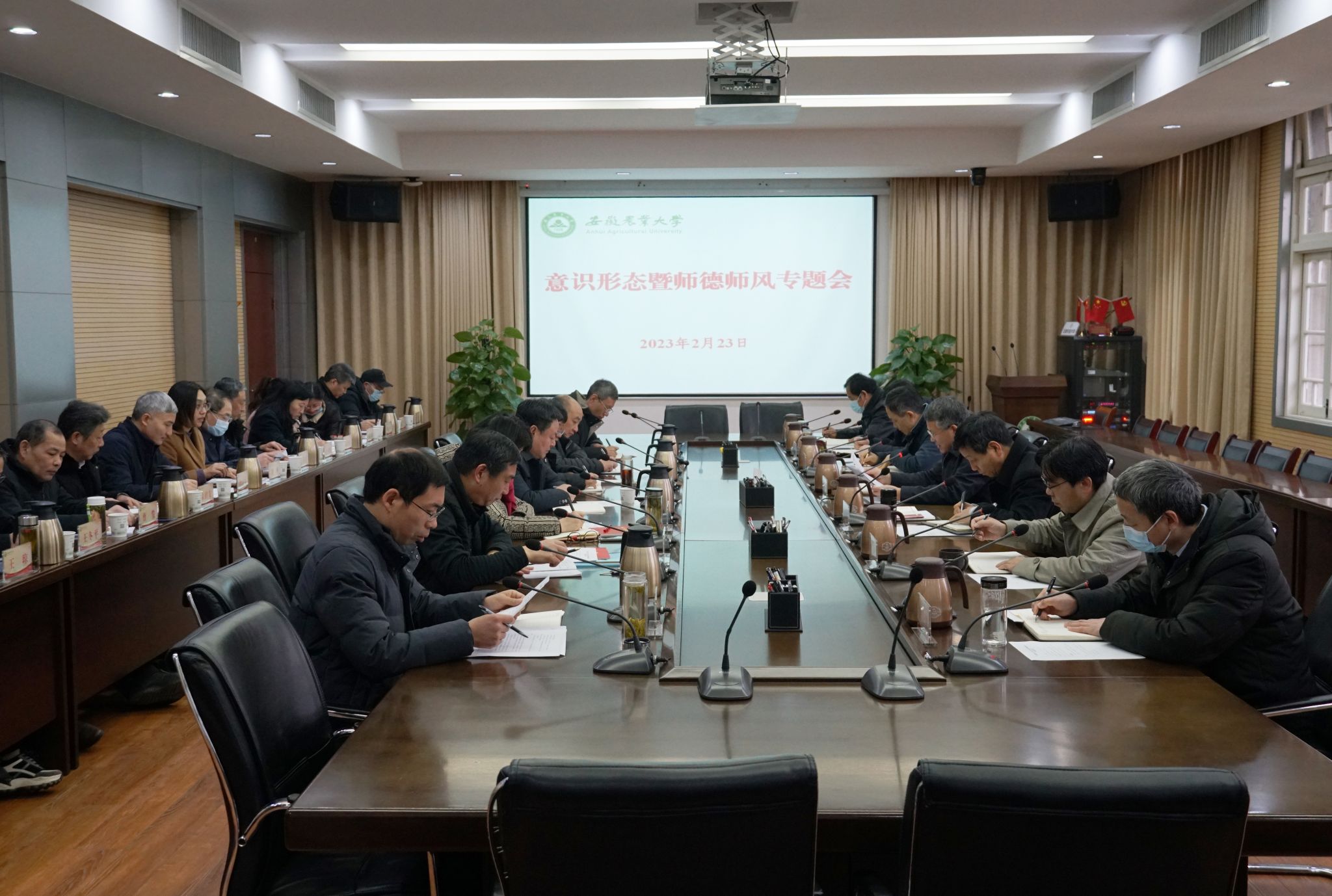 本网讯 2月23日上午,我校召开意识形态暨师德师风专题会,学习贯彻习近平总书记关于意识形态工作的重要论述,通报相关情况,研究部署相关工作。校党委书记常业军,党委副书记裴树东出席会议。相关单位、各学院主要负责同志参加会议。
