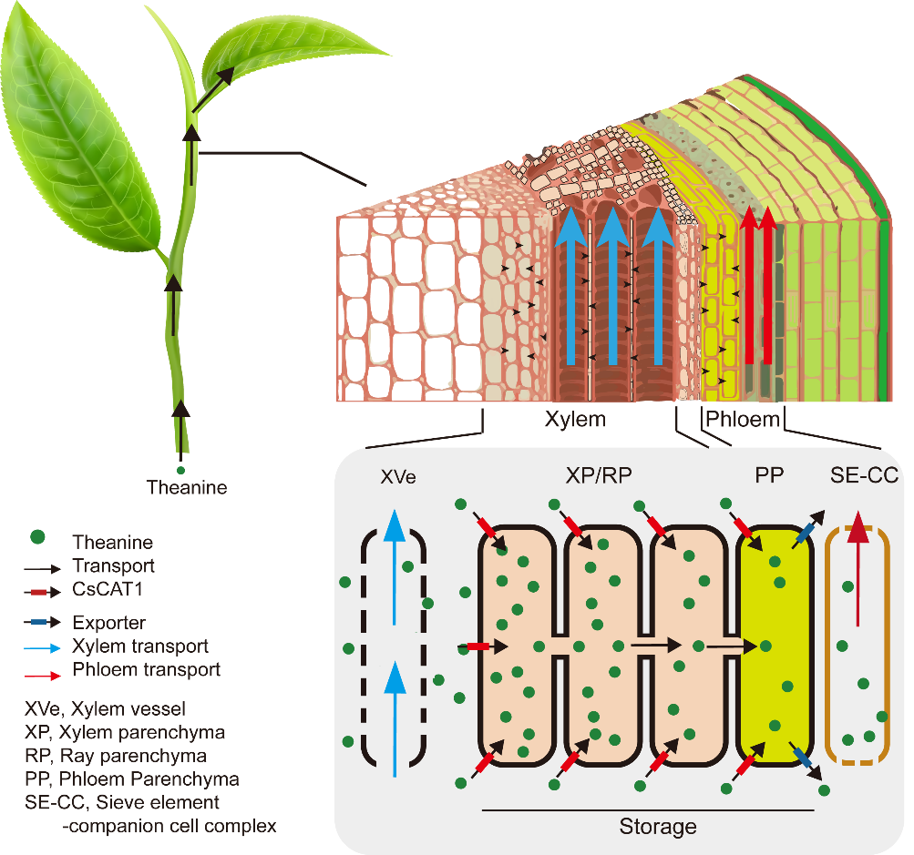 该研究报道了,CsCAT1调节茶树新梢茶氨酸在茎和叶之间的分布的分子机制,为增加茶叶中茶氨酸含量提供了重要的理论依据。