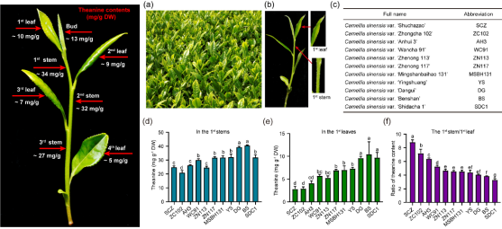 茶氨酸是一种茶树特有的非蛋白氨基酸,其含量占春茶游离氨基酸总量的40%-70%,是茶叶鲜爽滋味的主要物质,并具有抗焦虑、促睡眠、增强免疫力等健康功效而备受关注。它主要在茶树根部合成,并被运输到新梢。但在茶树新梢中嫩茎中的茶氨酸含量是嫩叶中的3-10倍(图1)。然而,很多茶叶,如抹茶、六安瓜片等只用嫩叶为原料,大部分乌龙茶加工过程的后期也需要“去梗”,不利于这些茶叶鲜味形成。因此阐明调控茶氨酸在茎和叶之间分布的分子机制,可以促进更多的茶氨酸向幼叶分配,进而提高茶叶品质。