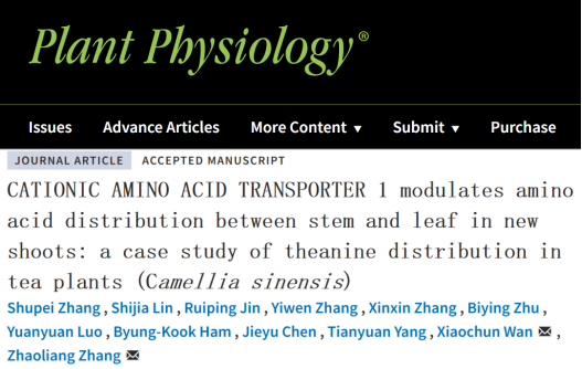 本网讯 近日,我校茶树种质创新与资源利用全国重点实验室张照亮与宛晓春等教授团队合作在国际知名植物学期刊《Plant Physiology》发表题为“CATIONIC AMINO ACID TRANSPORTER1 modulates amino acid distribution between stem and leaf in new shoots of tea plants”的研究论文。该研究揭示了茶树新梢茎叶间茶氨酸分配的分子调控机制,为通过分子育种及栽培措施提高茶叶品质提供了重要理论依据。