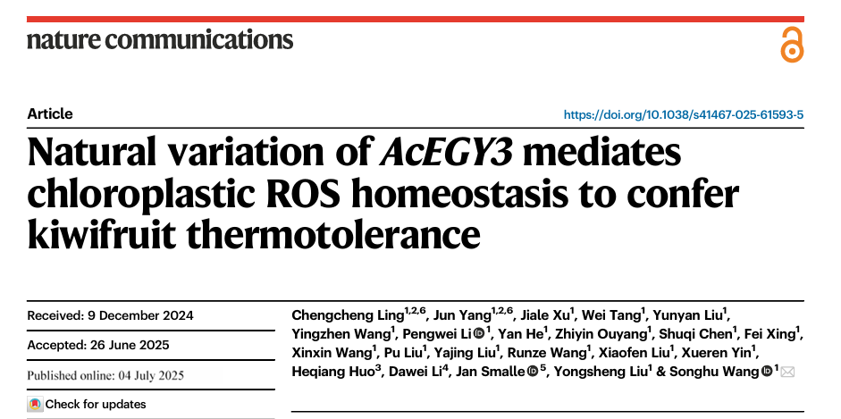 本网讯 7月5日,我校园艺学院汪松虎课题组在《Nature Communications》上发表了题为“Natural variation of AcEGY3 mediates chloroplastic ROS homeostasis to confer kiwifruit thermotolerance”的研究论文。该研究发掘了首个调控猕猴桃耐热性的自然变异,为提高猕猴桃耐热性的遗传改良提供重要的基因资源。