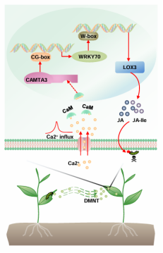 综上,本研究首次阐明了虫害诱导的挥发性物质DMNT通过Ca2+-CAMTA3-WRKY70-LOX3级联反应诱导茶树JA生物合成的分子机制(图4)。该发现加深了对挥发性物质参与植物间化学通讯,特别是植物解码挥发性物质内在机制的认知,也为挥发性物质在茶园绿色防控中的应用奠定了理论基础。
