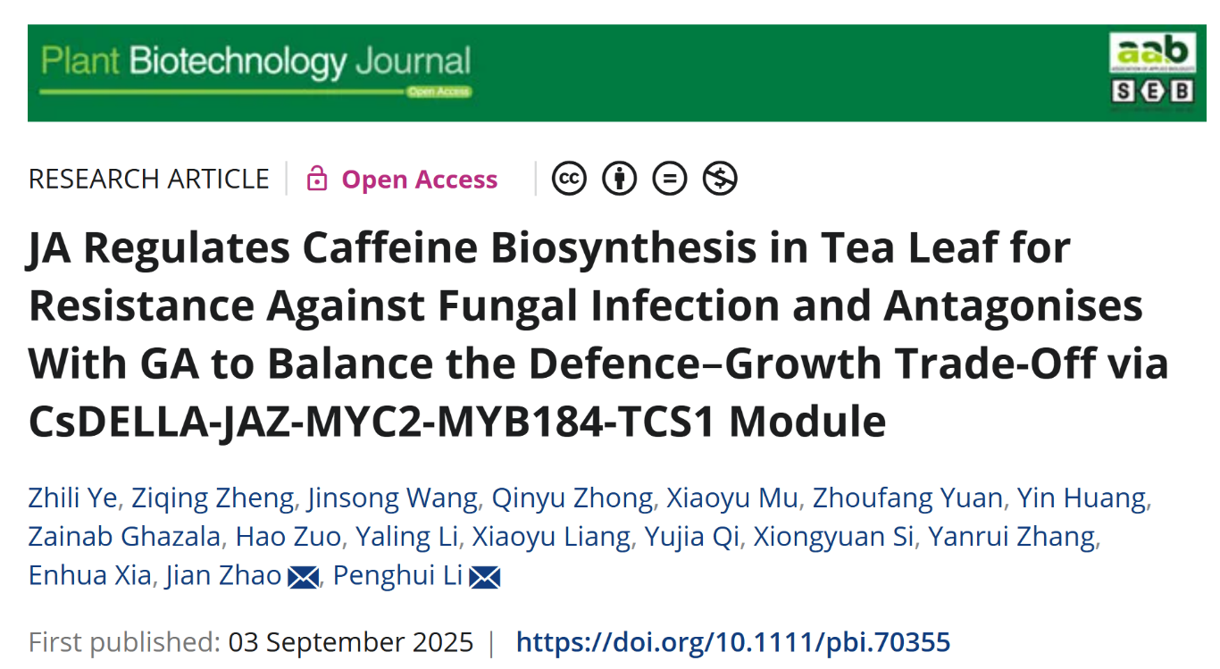 本网讯 近日,我校茶树种质创新与资源利用全国重点实验室李鹏辉教授团队在《Plant Biotechnology Journal》期刊在线发表了题为“JA Regulates Caffeine Biosynthesis in Tea Leaf for Resistance Against Fungal Infection and Antagonises With GA to Balance the Defence-Growth Trade-Off Via CsDELLA-JAZ-MYC2-MYB184-TCS1 Module”的研究论文,揭示了茉莉酸(JA)与赤霉素(GA)拮抗调控咖啡碱介导的茶树先天免疫防御分子机制,以及茶树在生长和发育的权衡。