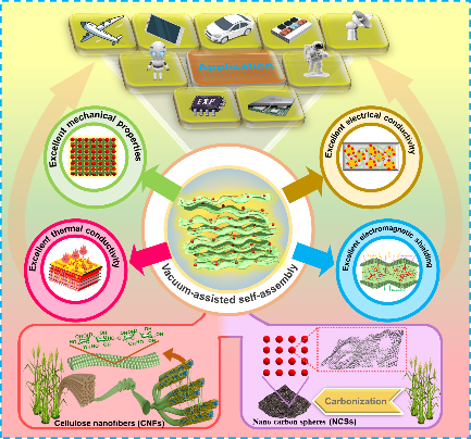 此项研究利用纤维素纳米纤维(CNFs)诱导纳米碳球(NCSs)自组装制备得到全生物质衍生纳米复合膜材料,重点探讨、分析了该复合膜材料的界面作用机理与性能调控机制。研究结果表明,高温热解处理促使NCSs形成有序石墨化结构,有助于实现π–π堆积增效、界面粘附增强与导电网络高效构筑,因而提升了复合膜材料的机械强度、热传导性能以及电磁干扰屏蔽能力。同时,该复合膜材料还具备红外隐身特性,并能在多次弯折循环中保持长效稳定,展现出卓越的柔韧性和耐用性。该复合膜材料同时兼顾全生物质组成、绿色制造工艺和多功能特性的协同优势,在环保型柔性电子、可穿戴设备及电磁干扰屏蔽等领域具有广阔的应用潜力,有望推动绿色电子材料的产业化发展。
