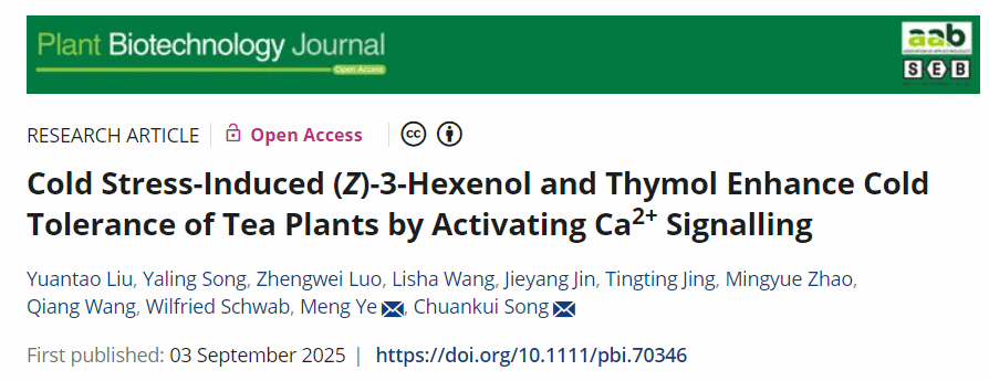 本网讯 近日,我校茶树种质创新与资源利用全国重点实验室宋传奎教授团队携手中国农业科学院茶叶研究所叶萌研究员,在植物学经典期刊《Plant Biotechnology Journal》发表了题为“Cold stress-induced (Z)-3-hexenol and thymol enhance cold tolerance of tea plants by activating Ca2+ signaling”的研究论文。该研究首次在茶树中建立了叶片原生质体的高频钙检测系统,揭示了钙信号在挥发性有机化合物(VOCs)介导的茶树抗寒响应中的关键作用。基于该系统,鉴定出两种可显著增强茶树耐寒性的VOCs——(Z)-3-己烯醇与麝香草酚,并证明它们通过激活细胞内Ca2+信号提升茶树的抗寒能力。该技术不仅为茶树抗逆机制研究提供了重要工具,也为其他难以稳定转基因的作物开展相关研究提供了可行方案。被筛选出的功能性VOCs成分有望成为作物抗逆育种与绿色防控的新候选小分子,对推动农业可持续发展具有重要意义。