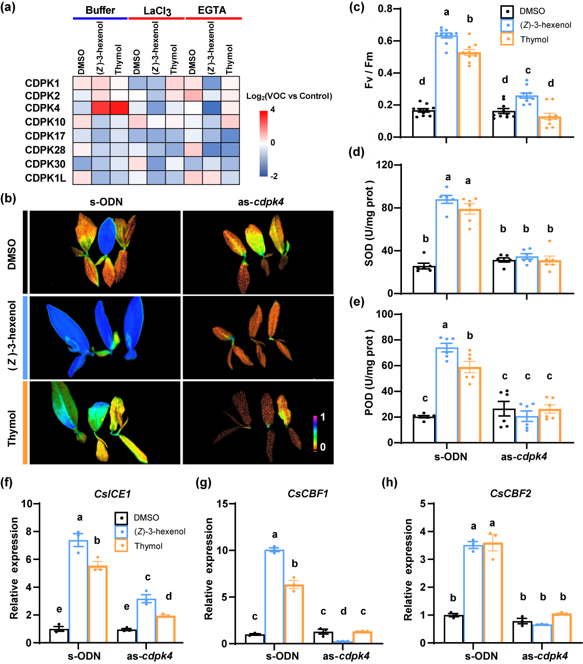 功能验证实验表明,这两种挥发物处理后,茶树中关键冷响应基因(如CsICE1、CsCBF1、CsCBF2)表达显著上调,抗氧化酶活性(超氧化物歧化酶SOD、过氧化物酶POD)提高,光合系统功能得到更好维持,茶树对低温胁迫的耐受性显著增强。药理学抑制实验进一步论证,通过Ca2+抑制剂可阻断上述基因与生理响应,表明Ca2+信号在该过程中的必要性。通过反义寡核苷酸介导的基因沉默实验,研究还鉴定出CsCDPK4是VOCs诱导的Ca2+信号解码并转导为下游抗寒反应的关键分子,其沉默会削弱VOCs带来的保护效应(图3),从而明确了Ca2+信号在茶树VOCs感知与冷防御机制中的重要地位。