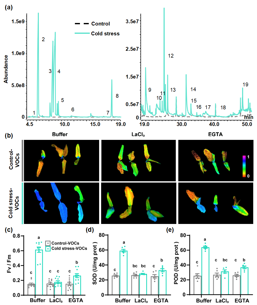 植物释放的VOCs是植物间信息传递的重要分子,可在胁迫预警、抗逆防御和繁殖等过程中发挥核心作用。大量研究显示,邻近植物释放的挥发物可以帮助健康植株提高对低温、干旱等非生物胁迫以及植食昆虫等生物胁迫的抵御能力。过去二十年间,这类信号交流现象在多种物种中被广泛观察到,体现了其重要的生态学功能和意义。然而,许多功能性VOCs的具体作用成分及其抗逆机制仍有待深入解析。