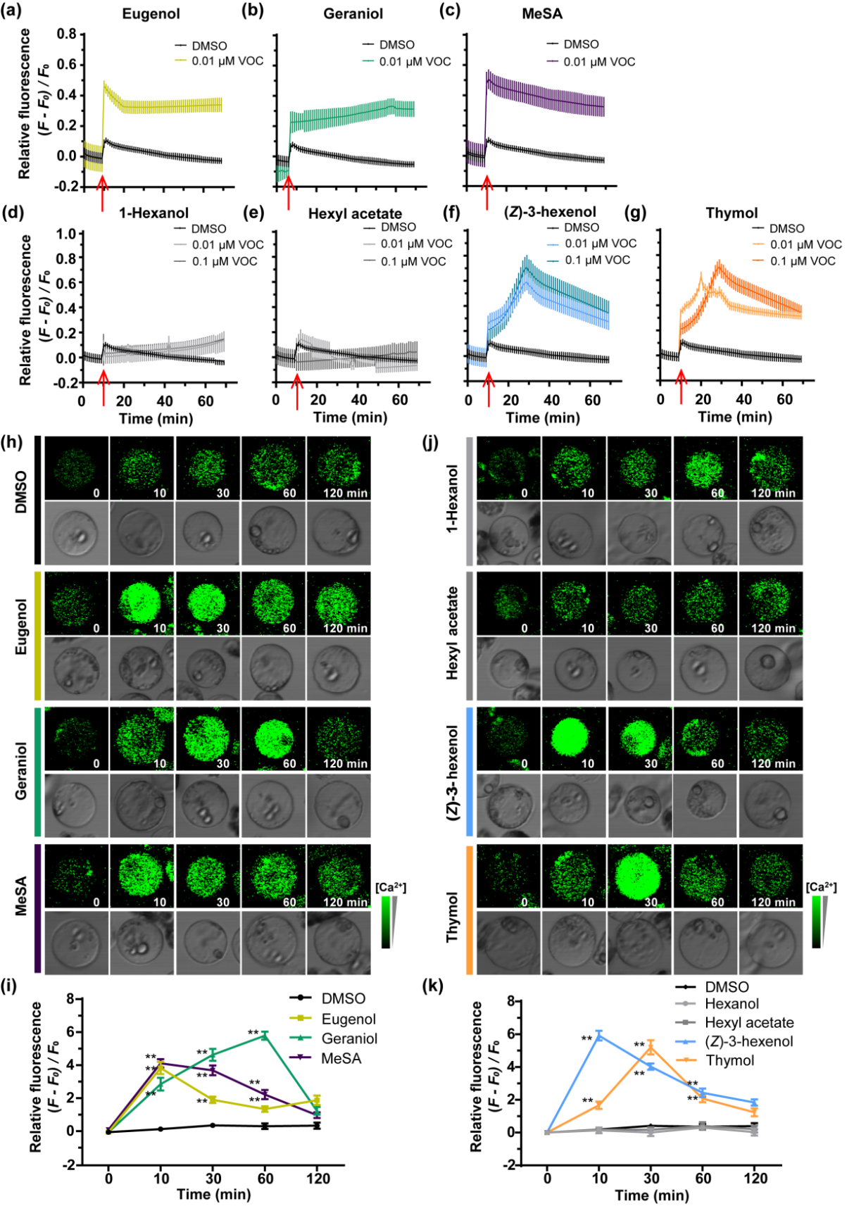 针对该技术瓶颈,本团队基于“VOCs可能通过Ca2+信号通路调控植物抗寒”的科学假设,利用钙特异性荧光染料Fluo-8,在茶树叶片原生质体中建立了秒级高频的Ca2+检测体系,实现了对细胞内Ca2+动态的实时监测。借助该平台,团队在冷胁迫诱导的VOCs中筛选出(Z)-3-己烯醇和麝香草酚为细胞Ca2+信号的高效激活剂(图2)。
