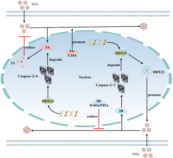 本网讯 近日,我校动物医学院兽医传染病学课题组孙裴教授团队携手动物科技学院殷宗俊教授团队在国际权威学术期刊《Journal of Virology》发表了题为“3A and 2B proteins of SVA play chess game with host restriction factor DDX23 by apoptotic pathway”的研究论文。揭示了A型塞内卡病毒的3A和2B非结构蛋白如何通过凋亡途径与宿主DEAD-box RNA解旋酶23(DEAD-box helicase 23, DDX23)展开相互调控。该研究首次阐明了DDX23抑制SVA复制的机制,以及病毒的反制策略。这为理解病毒-宿主互动提供了新视角,并为针对性抗病毒策略和疫苗开发奠定基础。