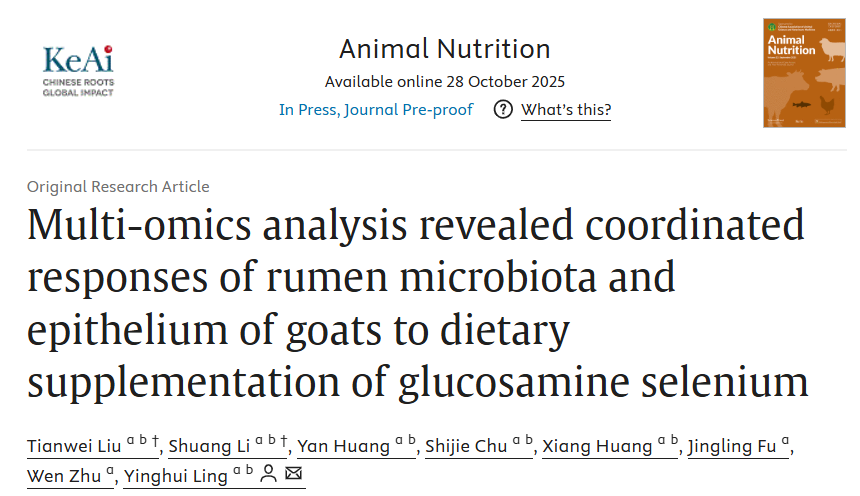 本网讯 我校动物科技学院凌英会教授课题组在《Animal Nutrition》(中科院1区,Top期刊)上发表了题为《Multi-omics analysis revealed coordinated responses of rumen microbiota and epithelium of goat to dietary supplementation of glucosamine selenium》的研究论文,该研究揭示了氨基葡萄糖硒(GASe)对山羊瘤胃上皮微生物与上皮组织的协同调控机制,为深入解析硒在反刍动物中的生理调控作用提供了新的科学视角,同时为反刍动物精准的硒营养管理提供理论支撑。