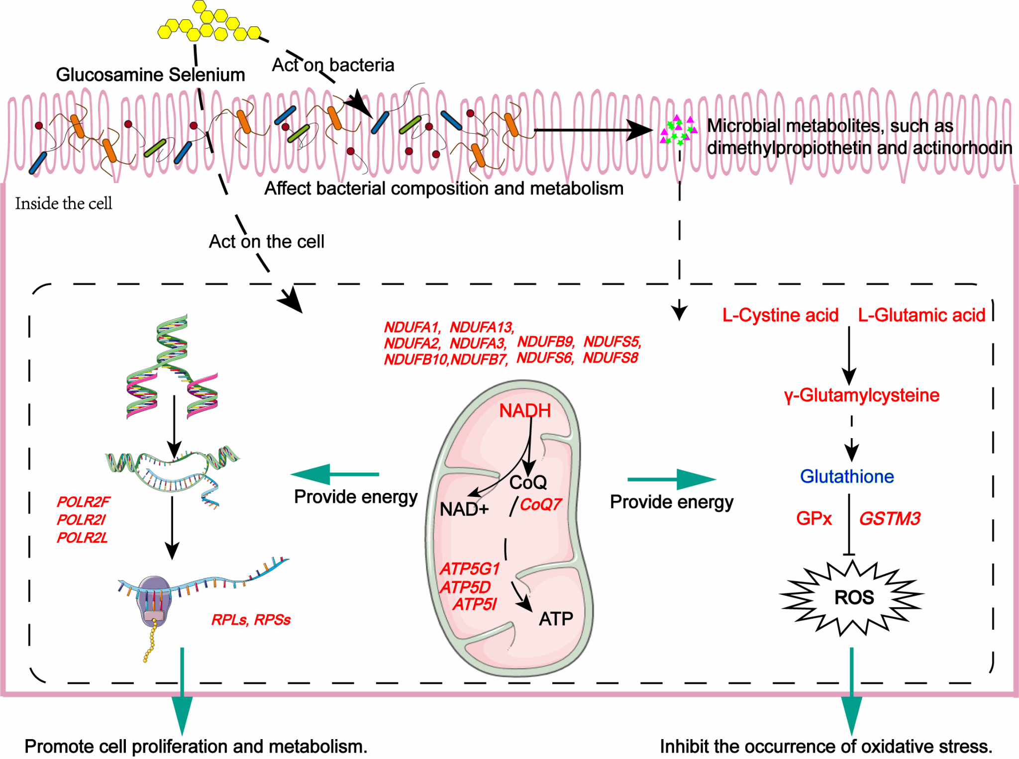 此外,多组学联合分析结果显示,补充0.6 mg Se/kg可显著激活核糖体合成、氧化磷酸化和核苷酸代谢等通路,从而促进能量代谢与蛋白质合成;同时,该剂量还提高了有益菌的丰度,并降低了致病菌Campylobacter的相对丰度。代谢组学分析进一步发现,两种仅由微生物产生的代谢物——Actinorhodin和Dimethylpropiothetin——与瘤胃上皮的抗氧化能力和发育水平均呈显著正相关。通过二次回归分析,课题组确定皖临白山羊日粮中氨基葡萄糖硒(GASe)的适宜补充范围为0.598–0.832 mg Se/kg,可实现生长性能与抗氧化功能的最佳平衡。