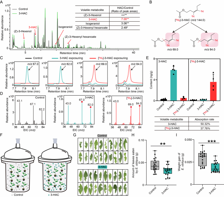 茶尺蠖是茶园中发生最普遍,危害最严重的食叶害虫之一,对茶叶产量和品质造成严重威胁。团队前期研究发现:茶树被茶尺蠖取食后,其体内茉莉酸信号被诱导而合成更多的3-HAC,从而提升受害茶树对茶尺蠖的防御 (Gu et al., New Phytol, 2024)。然而,3-HAC作为外源信号分子能否被健康茶树所吸收而增强其对茶尺蠖的抗性及其机制尚未见报道。为此,本研究以外源3-HAC处理茶树后,其叶片中3-HAC的含量显著提升,进一步以稳定同位素标记的3-HAC处理茶树,发现其叶片对[²H₂]-3-HAC高效吸收(吸收率为37.76%),同时发现经外源3-HAC处理后的茶树,能显著降低茶尺蠖的取食量和体重增长,表明其直接增强茶树的抗虫性(图1)。