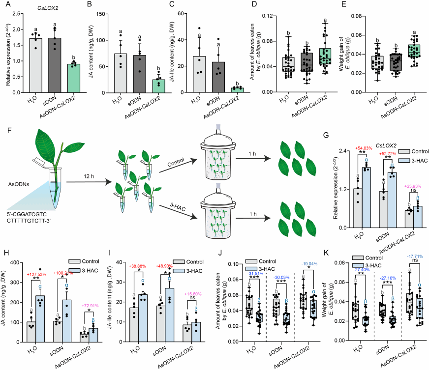为探究3-HAC抗虫分子机制,代谢组与转录组联合分析显示,3-HAC可显著激活茶树JA信号途径,并筛选出JA合成关键差异基因CsLOX2。在茶树中抑制CsLOX2后,叶片JA含量及对茶尺蠖的取食抗性均显著降低,而外源3-HAC处理可恢复茶树的JA含量与抗虫性(图2),说明茶树被外源3-HAC处理后,其CsLOX2基因上调表达合成更多的JA而增强对茶尺蠖的抗性。