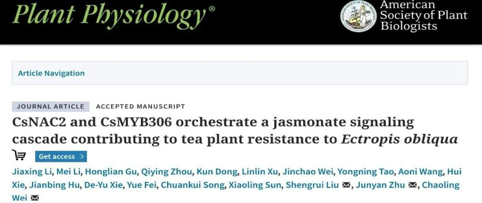 本网讯 近日,学校茶树种质创新与资源利用全国重点实验室韦朝领团队在《Plant Physiology》期刊在线发表了题为“CsNAC2 and CsMYB306 orchestrate a jasmonate signaling cascade contributing to tea plant resistance to Ectropis obliqua”的研究论文,该研究揭示乙酸叶醇酯(3-HAC)(一种虫害诱导植物挥发物,HIPVs)作为外源信号分子,能够被茶树吸收并通过转录因子CsNAC2/CsMYB306上调CsLOX2表达,进而激活茉莉酸信号途径增强茶树对茶尺蠖抗性。这一发现进一步拓展了人们对HIPVs增强植物对害虫防御能力的理解,同时为茶园害虫绿色防控技术研发提供新的理论依据。