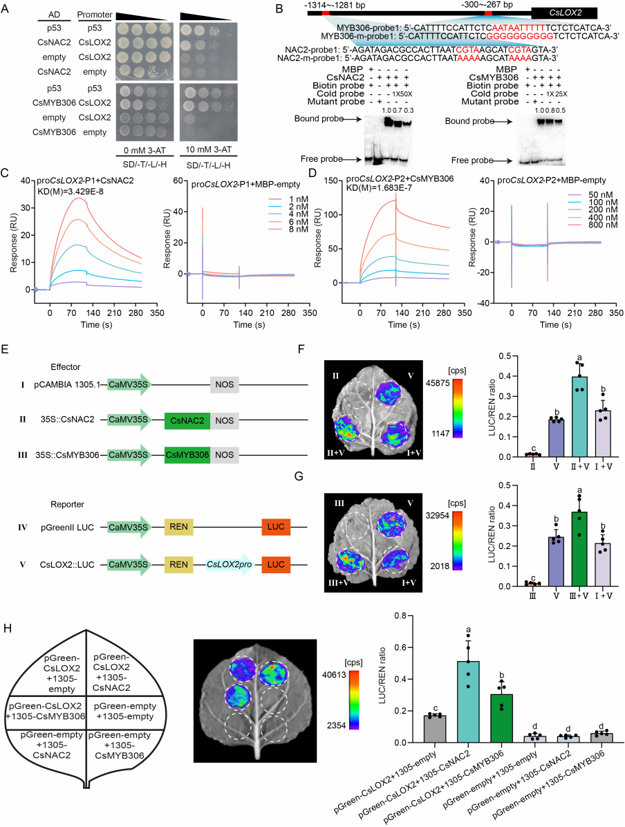 图3 CsNAC2和CsMYB306正向激活了CsLOX2的表达