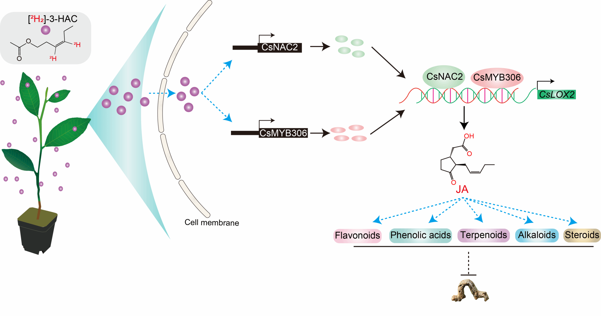 基于转录组相关性网络分析和启动子顺式作用元件筛选发现,转录因子CsNAC2和CsMYB306与CsLOX2表达高度相关,进一步通过酵母单杂(Y1H),表面等离子体共振(SPR)等实验证实,这两个转录因子正调控CsLOX2表达;反义抑制与外源3-HAC处理实验进一步表明,3-HAC通过诱导CsNAC2和CsMYB306上调表达CsLOX2,进而促进JA合成(图3),以增强茶树对茶尺蠖的抗性。