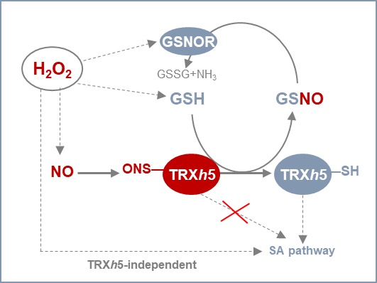 本研究首先通过一系列生理生化实验发现,TRXh5以一种GSH依赖的方式参与到氧化应激触发的水杨酸反应。通过体内外的生物素开关分析实验并结合质谱技术发现,GSH对氧化应激诱导的TRXh5的亚硝基化具有还原作用,即去亚硝基化,并鉴定了TRXh5的两个活性半胱氨酸为特定的亚硝基化位点。此外,生化和遗传证据显示GSH介导的TRXh5去亚硝基化依赖于亚硝基谷胱甘肽还原酶(GSNOR)活性,并且GSNOR和TRXh5可能相互作用形成蛋白复合物,从而在氧化应激介导的水杨酸信号通路中发挥重要的作用。