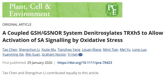 本网讯 近日,生命科学学院韩毅教授团队在《Plant, Cell & Environment》杂志在线发表了题为“ A Coupled GSH/GSNOR System Denitrosylates TRXh5 to Allow Activation of SA Signalling by Oxidative Stress ” 的研究论文,揭示了还原型谷胱甘肽 (GSH) 和亚硝基谷胱甘肽还原酶 (GSNOR) 通过形成一个耦合的还原系统,调控硫氧还蛋白h5 (TRXh5) 的亚硝基化水平,从而促进氧化应激介导的水杨酸信号通路。