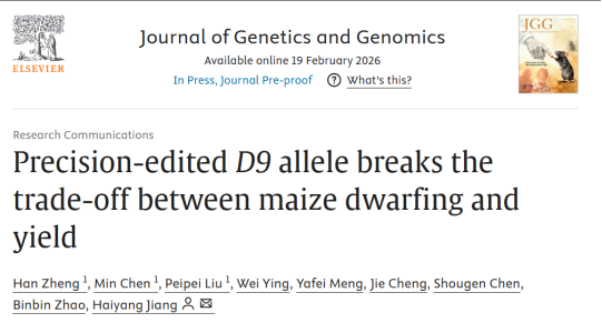 本网讯 2月19日,学校江海洋教授团队在《Journal of Genetics and Genomics》杂志在线发表了题为“Precision-edited D9 allele breaks the trade-off between maize dwarfing and yield”的研究论文,该研究发现玉米DELLA蛋白D9的G571V点突变可实现植株适度矮化且不影响产量相关性状,为玉米矮秆育种提供高效技术路径与优异基因资源。