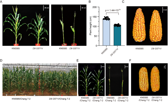 A和B:KN5585野生型与D9 G571V突变体株高和穗位高及统计分析;C:KN5585野生型与D9 G571V突变体果穗;D–E:KN5585野生型与D9 G571V突变体分别与昌7-2杂交后的F1代在田间的整体株高(D)和穗位高(E)及果穗(F)比较。
