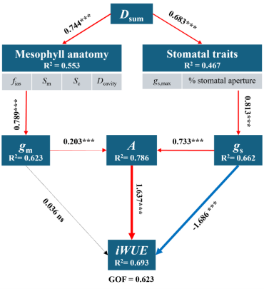 而在干旱胁迫条件下,水稻气孔开度会随干旱程度加剧快速下降,高气孔密度对气孔导度的促进作用逐渐减弱直至消失,但其对叶肉导度的提升效应在整个叶片水势变化范围内均能维持。研究团队发现,高气孔密度可通过增加单位叶面积的气孔下腔面积,扩大 CO2 扩散的有效表面积,从而维持较高的叶肉导度。与此同时,干旱下气孔导度的下降速率显著快于光合速率和叶肉导度,使得水稻光合限制因素向气孔限制偏移,最终实现了光合速率与内在水分利用效率的协同提升。