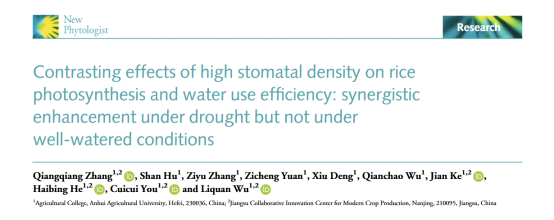 本网讯 近日,学校水稻栽培创新团队武立权教授在植物学经典期刊《New Phytologist》在线发表题为“Contrasting effects of high stomatal density on rice photosynthesis and water use efficiency: synergistic enhancement under drought but not under well-watered conditions”的最新研究成果, 首次系统阐明了气孔密度对水稻光合作用和内在水分利用效率的调控作用具有显著的水分条件依赖性,即高气孔密度在正常供水条件下仅能提高光合速率,无法实现二者的协同改善,但在干旱胁迫下可协同提升水稻光合速率与水分利用效率。该研究为水稻高产抗旱育种提供了重要的理论依据和关键生理靶标。