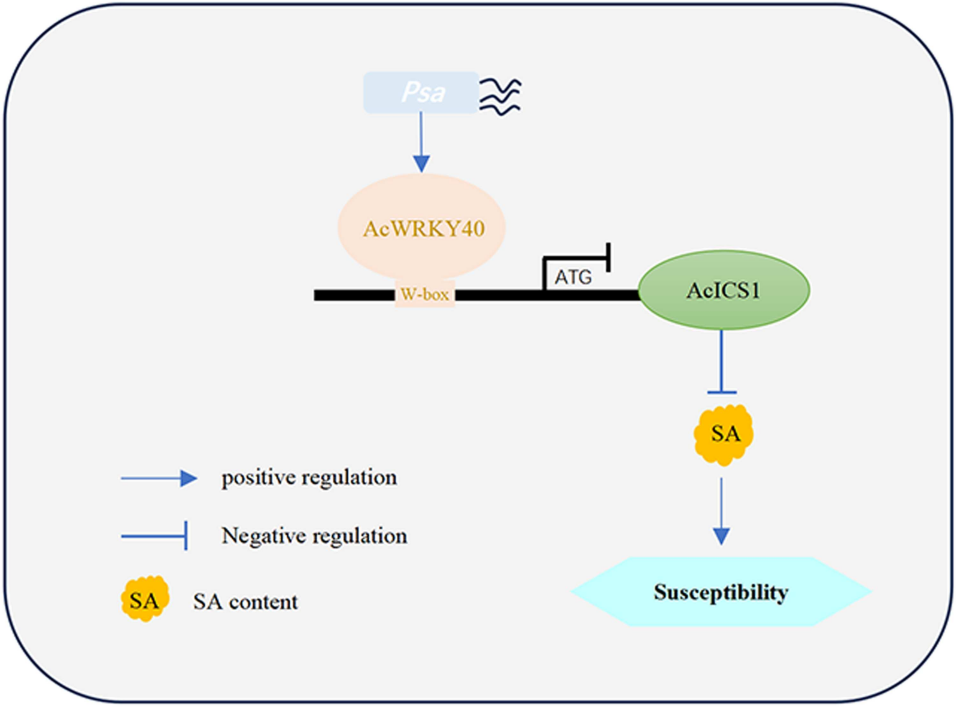 研究首次揭示,转录因子AcWRKY40通过直接抑制AcICS1转录、负向调控SA合成,从而降低猕猴桃对溃疡病的抗性。功能实验表明,AcICS1过表达显著增强抗病性,而AcICS1缺失则提高感病性;外源SA处理可完全恢复AcICS1沉默植株的抗病能力。综上,AcICS1通过调控SA合成及防御基因表达赋予抗病性。进一步研究发现,AcWRKY40能特异性结合AcICS1启动子上的W-box元件,抑制其表达;Psa侵染可诱导AcWRKY40上调,表明AcWRKY40在转录水平负调控AcICS1,可精细调节SA介导的免疫应答。