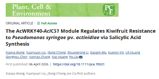 本网讯 近日,学校园艺学院果树抗病机制与种质创新团队在《Plant, Cell & Environment》上在线发表题为“The AcWRKY40-AcICS1 Module Regulates Kiwifruit Resistance to Pseudomonas syringae pv. actinidiae via Salicylic Acid Synthesis”的研究论文,揭示了猕猴桃溃疡病抗性的新机制。