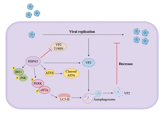 本研究从HSP家族基因子集筛选入手,通过过表达、敲除、免疫沉淀、共聚焦显微镜成像、抑制剂处理和反向遗传学等方法,首次系统揭示了HSPA5通过PERK-eIF2α通路诱导自噬降解病毒VP2蛋白,从而抑制SVA复制的分子机制;HSPA5的NBD区域对VP2降解至关重要,VP2的Thr180残基被鉴定为HSPA5抑制VP2蛋白的关键靶点。这一机制拓展了HSP家族在宿主抗小RNA病毒感染中的功能认知,强调UPR-自噬轴在靶向病毒蛋白降解中的关键调控作用。上述发现为理解SVA的致病机制提供了重要基础,其中VP2蛋白的Thr180残基可作为潜在的抗病毒靶点。这些成果将为减轻SVA对养猪业造成的危害和开发新型抗病毒干预手段提供理论支撑。
