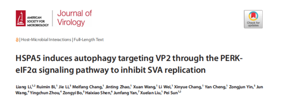 本网讯 近日,学校动物医学院兽医传染病学课题组孙裴教授团队在国际权威学术期刊《Journal of Virology》发表了题为“HSPA5 induces autophagy targeting VP2 through the PERK-eIF2α signaling pathway to inhibit SVA replication”的研究论文。阐述了HSPA5通过调控自噬介导的VP2降解进而抑制SVA复制的机制研究。这一发现拓宽了SVA的抗病毒谱系,深化了对SVA抗病毒机制及病毒-宿主相互作用的认识,为有效疫苗的研发提供了重要线索。