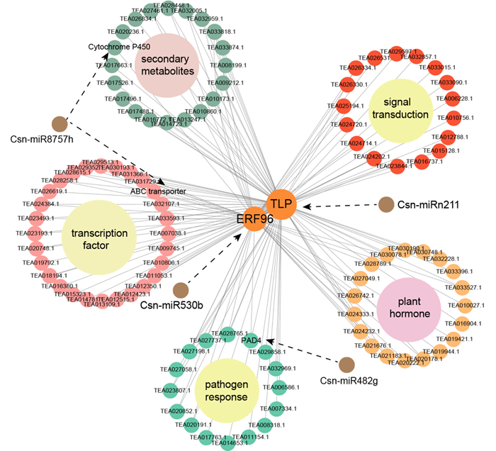 通过WGCNA鉴定到两组关键基因对miR530b-ERF96和miRn211-TLP参与茶树免疫反应,并通过在烟草中瞬时转化、反义寡核苷酸抑制基因表达以及一些生理指标的测定等对其功能进行了验证。