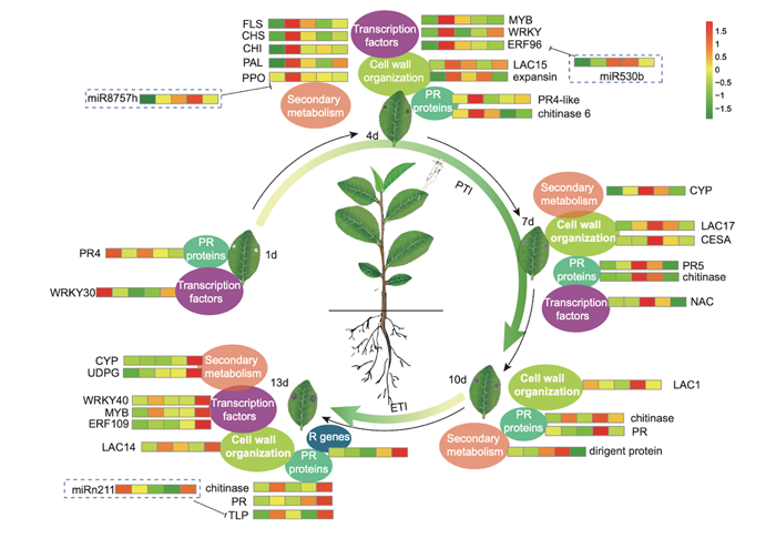 为了探究茶树的动态免疫机制,对轮斑病病原菌侵染后第1、4、7、10和13 d的茶树叶片进行转录组、small RNA和降解组测序,鉴定到2116个差异基因和95个差异miRNA;进一步分析研究发现,茶树对轮斑病的防御机制是复杂的且是多层面的。首先是通过对病原菌的识别诱导PR的表达,激活了PTI反应,进而诱导次级代谢产物以及细胞壁形态的变化。在茶树与病原菌的博弈之中,茶树的免疫反应随着侵染时间的延长逐渐变弱,为了更有效的抵御病原菌,在第13天时茶树通过特异性的招募R基因启动了第二道免疫反应ETI。在此动态调控网络中,PR作为基础性防御基因贯穿于整个防御反应,类黄酮类(尤其是非酯型儿茶素)在茶树受到病原菌侵染的第4天起着最主要的防御作用,另外,细胞壁的厚度在受到病原菌侵染的第1天时显著降低,随后,细胞壁会产生胼胝体等使细胞壁逐渐变厚(图1)。