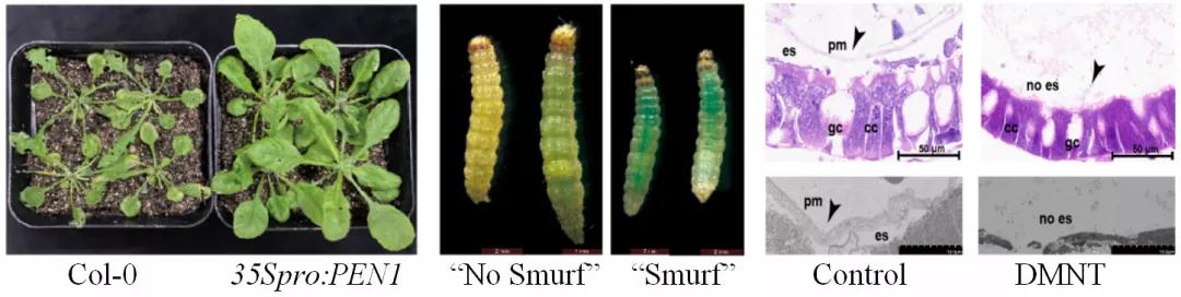 通过近五年的研究,李培金团队发现,过表达DMNT合成酶关键基因PEN1的转基因拟南芥能够驱逐并显著抑制小菜蛾幼虫的生长和繁殖,化学合成的DMNT验证了该实验结果。进一步研究发现DMNT处理能破坏小菜蛾中肠内围食膜结构(peritrophic matrix),致使肠道保护屏障受损,最终导致肠道内微生物群落紊乱和幼虫死亡。尤为重要的是,肠道微生物在DMNT杀虫过程中发挥了关键作用。此外,该研究还发现DMNT能下调PxMucin基因的表达,从而影响围食膜的稳定。该工作系统揭示了DMNT参与植物直接抗虫的作用机制,为农作物抗虫育种研究提供了重要基因资源和理论依据。围绕这些研究,获国家发明专利授权2项,国家新型实用专利授权1项。