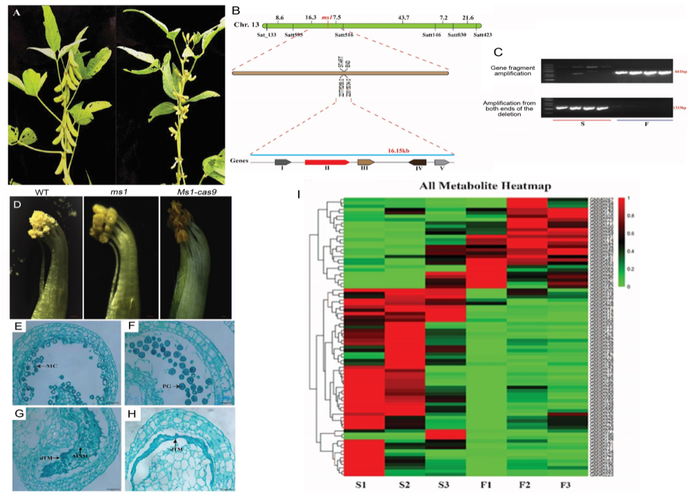 该研究利用SLAF_BSA精细定位了ms1基因,结合第三代测序技术和代谢组学技术,发现大豆ms1细胞核雄性不育系中一个大片段(16.15 kb)缺失与不育性密切相关,该区间内包含5个蛋白编码基因。研究发现,这些基因的转录本在不育系中无扩增产物,而在可育系中有目标扩增产物。利用CRIPSR/Cas9对编码微管马达驱动蛋白Glyma.13G114200(NACK2)基因进行靶向敲除,使栽培大豆品种中品661产生了与ms1不育系相同的不育表型,成功证明了该基因是控制大豆ms1核育性的功能基因。代谢组学研究进一步揭示了苯丙烷、植物激素以及淀粉和蔗糖等多种代谢途径紊乱是导致大豆细胞核雄性不育的主要原因。大豆ms1细胞核雄性不育基因的成功克隆,为针对大豆基因组结构变异的功能基因挖掘提供了新思路,为系统开展高效大豆“智能不育系”构建和基于细胞核雄性不育的大豆杂交制种技术研发奠定了基础,对于将杂种优势应用于提高我国大豆单产水平具有重要的理论和科学价值。