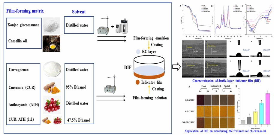 研究团队经过三年的研究积累,针对肉品新鲜度检测繁琐、成本高等问题,研究人员巧妙地构建了双层指示薄膜(DIF,由卡拉胶(CAR),姜黄素(CUR)和/或花青素(ATH)制成的指示层,以及由魔芋葡甘聚糖(KGM)和山茶油制成的乳化层(KC层)以监测肉品的新鲜度,开发了能指示肉品腐败变质的防水智能指示包装。相关研究内容发表在中科院一区杂志《Food Hydrocolloids》(Top期刊,IF: 9.147)上,我校硕士研究生周希为第一作者,熊国远教授为通讯作者,本校为第一单位。全文链接:https://doi.org/10.1016/j.foodhyd.2021.106695