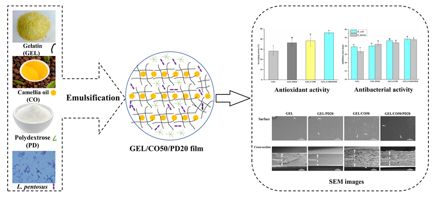 基于明胶/聚葡萄糖/山茶油并加入戊糖乳杆菌的新型乳液薄膜的物理、结构和抗菌性能的研究及开发。相关研究内容发表在中科院一区杂志《Food Hydrocolloids》(Top期刊,IF: 9.147)上,我校硕士研究生纵心想为第一作者,熊国远教授为通讯作者,本校为第一单位。全文链接:https://doi.org/10.1016/j.foodhyd.2021.107063