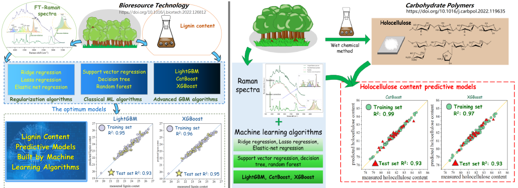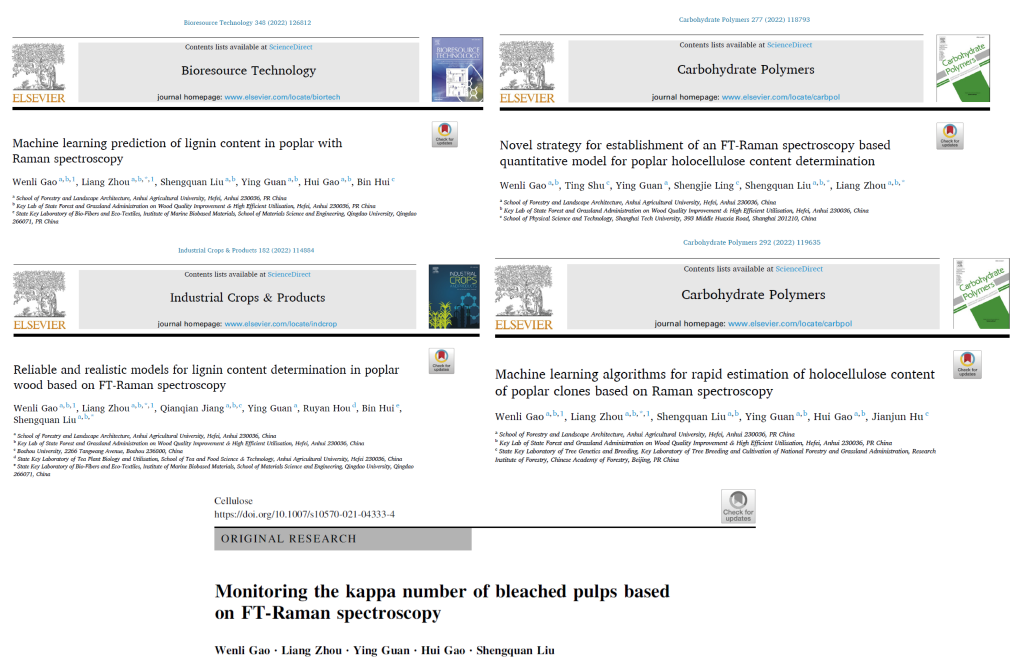 为了解决这一技术“瓶颈”,我校“林木材质改良与高效利用”国家林业与草原局重点实验室刘盛全课题组与长三角地区上海科技大学凌盛杰教授课题组合作,通过采集150组不同杨树木粉的傅里叶变换拉曼光谱并对其进行处理和信息提取,再基于多种化学计量学方法,建立了一系列预测模型,实现了对杨树木材综纤维素和木质素含量的快速定量预测。相关研究成果今年先后在国际高水平期刊《生物质技术》(Bioresource Technology)(中科院一区TOP期刊,影响因子为9.642)、《碳水化合物》(Carbohydrate Polymers)(中科院一区TOP期刊,影响因子为9.381)、《工业作物与产品》(Industrial crops & products)(中科院一区TOP期刊,影响因子为5.645)、《纤维素》(Cellulose)(中科院一区TOP期刊,影响因子为5.044)连续发表了5篇高水平学术论文。