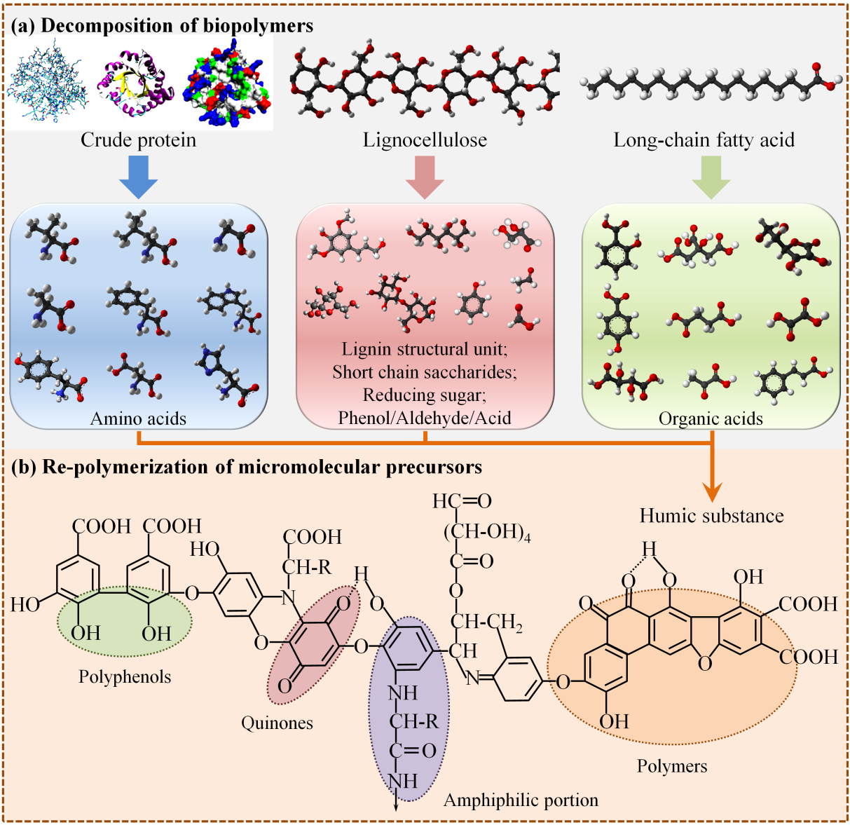 针对传统LM堆肥造成的养分损失和有毒微污染物残留等环境问题,本论文系统地提出利用胞外漆酶诱导腐殖化改善LM堆肥终产物的农艺质量。采用酶固定化技术、调节內/外源产漆酶微生物活性和丰度等,均可促进LM堆肥中雌激素、抗生素和重金属等有毒微污染物的消除和转化,以及腐殖质、类腐殖质和类生长素等腐殖化产物的生成,进而提高堆肥产品的农艺质量。图片展示了胞外漆酶在LM堆肥中发挥氧化分解和自由基聚合的双功能机制。该机制有利于加速微污染物解毒、促进酚类和氨基酸等小分子底物腐殖化和再聚合。与传统LM堆肥相比,胞外漆酶诱导LM堆肥产生更加稳定、有益、无害的腐殖化产物,它们可作为土壤肥料/调节剂,助益植物生长发育和农作物增产增收。然而,其结构-功能与植物促生长的相关机制仍需仔细破译。
