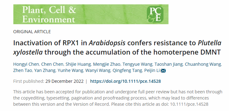本网讯 近日,我校生命科学学院作物抗逆育种与减灾国家地方联合工程实验室李培金教授团队在期刊Plant, Cell & Environment(PCE)上发表了题为“Inactivation of RPX1 in Arabidopsis confers resistance to Plutella xylostella through the accumulation of the homoterpene DMNT”的研究论文。该研究揭示了eIF4E家族的新型帽子结合蛋白RPX1(resistance to Plutella xylostella)参与拟南芥抵御十字花科害虫小菜蛾侵食的分子机制。