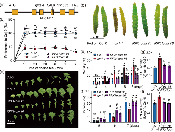 本次研究发现,RPX1突变导致了DMNT合成关键基因PEN1表达水平升高和DMNT积累,提高了植物对害虫的抗性。强制性饲喂实验显示,rpx1突变体能导致小菜蛾中肠围食膜结构(PM)被破坏,说明突变体中DMNT的积累是导致害虫排斥性和死亡率提高的重要因素之一。同时,同位素2H标记的DMNT-2H运输实验证实DMNT在根中合成,并且运输到地上部分发挥杀虫作用。在小菜蛾侵害24小时后,Col-0和rpx1突变体中JA和SA的含量均有增加但变化程度不同,说明JA和SA可能也在rpx1对小菜蛾的抗性中也发挥着重要作用。此外,小菜蛾侵害能引起RPX1-GFP降解,可能进而使植物产生抗虫性。更为重要的是,rpx1突变对植物种子产量没有显著负面影响,为后期利用基因编辑技术开发应用RPX1基因,开展植物抗虫分子育种的工作提供了一条可能途径。