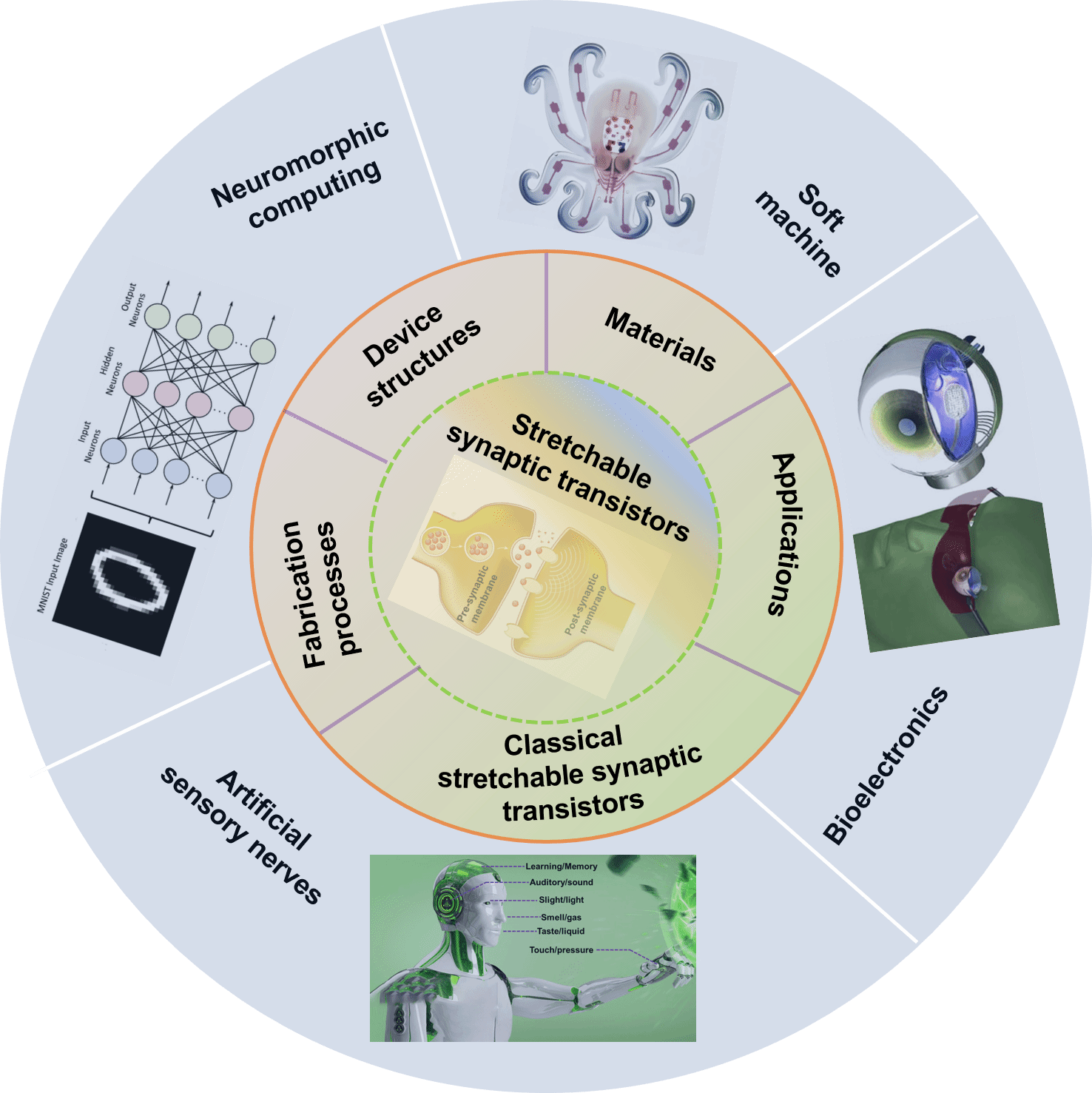 本网讯 近日,我校理学院光电材料与器件团队与合作者在材料科学国际顶级期刊《Small》(IF=15.153)上发表了题为“Stretchable Transistor-Structured Artificial Synapses for Neuromorphic Electronics”的综述文章(Small, 2023, 2205395)。